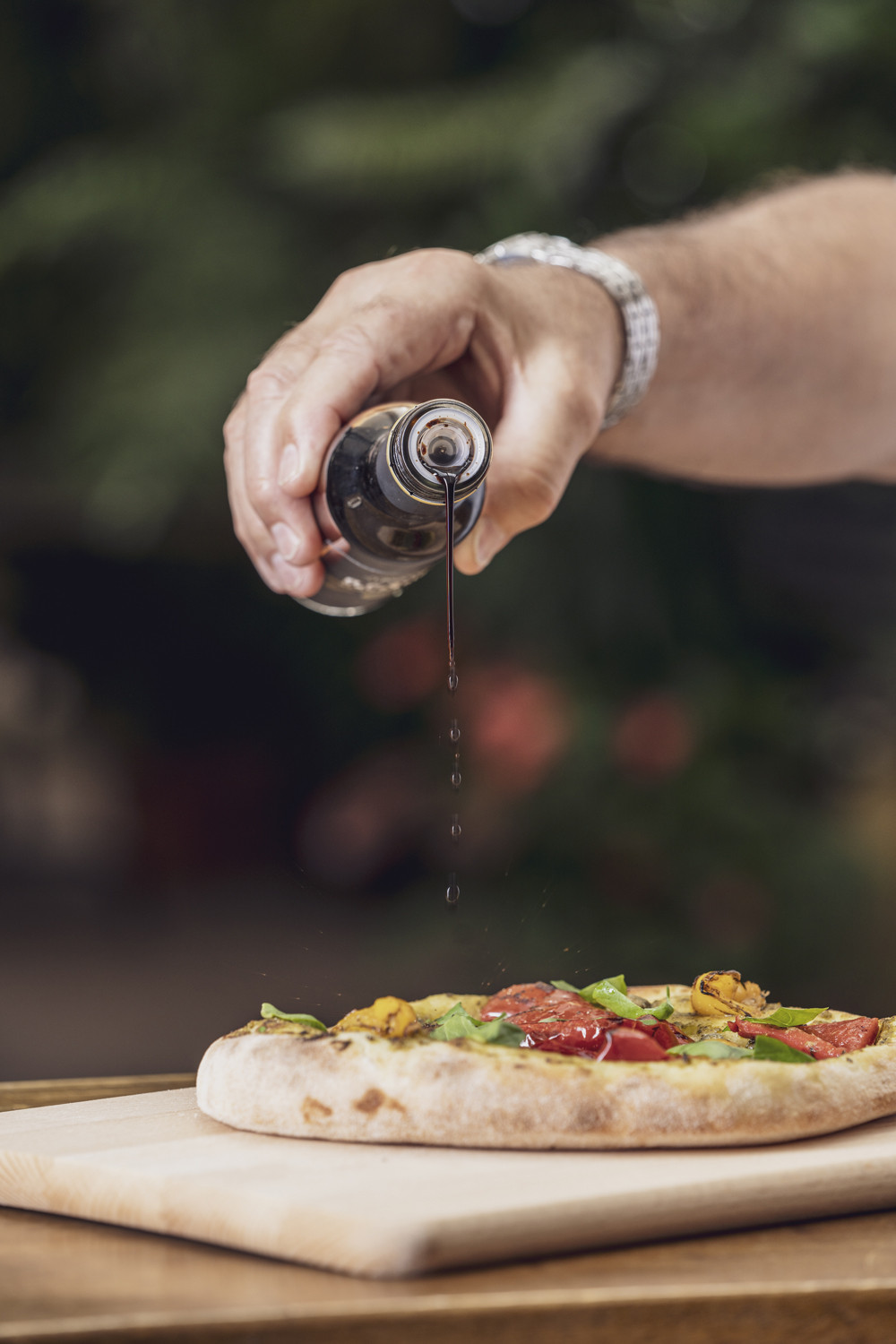 Tomatensauce, Mozzarella, Rohschinken, Rucola, frische Tomaten